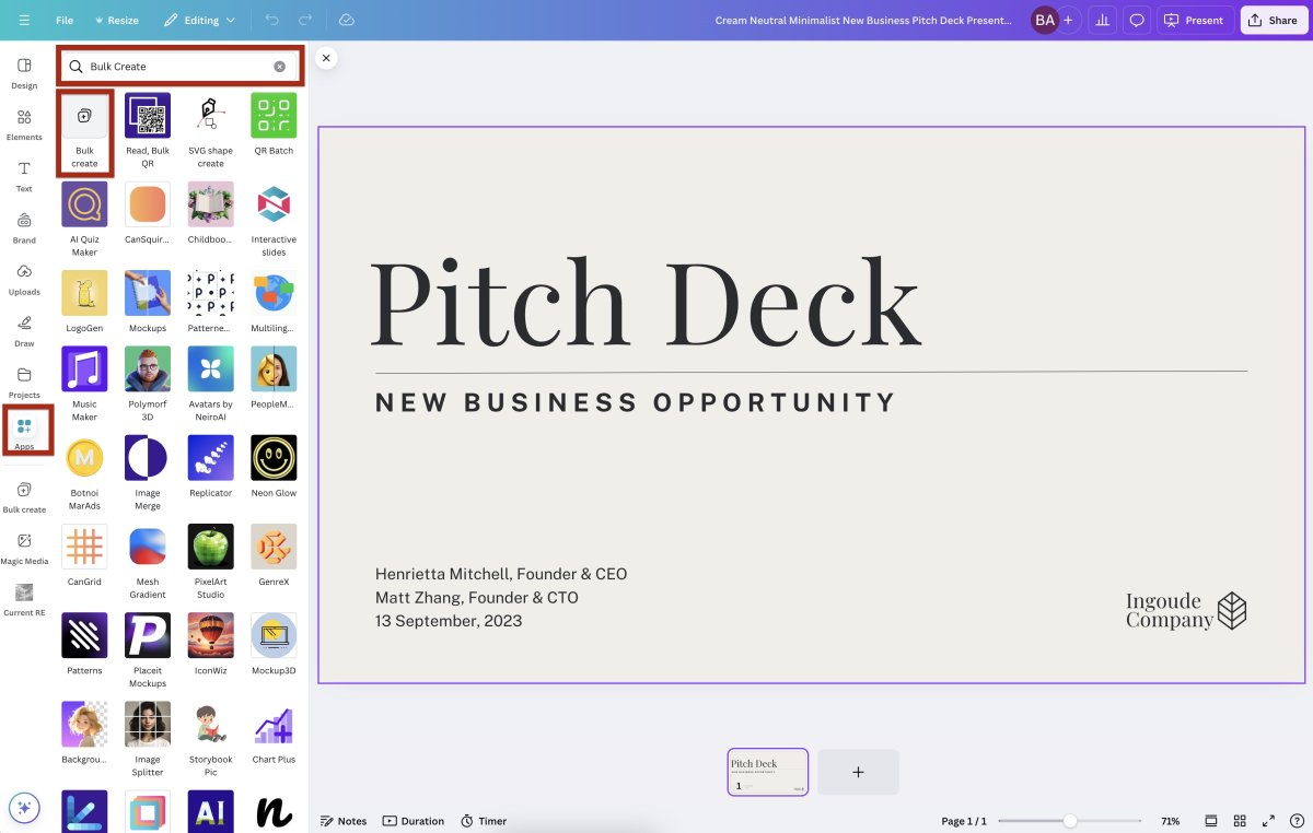 - In Canva, go to the Apps menu on the left sidebar and search for Bulk Create (or locate it under "More").