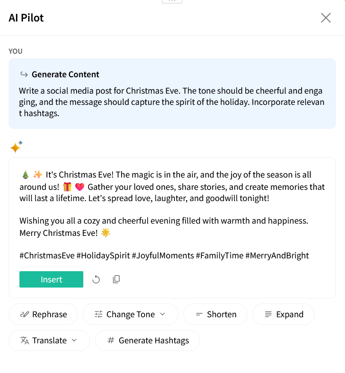 - Seasonal Posts: Need a festive caption for Christmas Eve? AI Pilot can provide warm, cheerful text that aligns perfectly with the holiday spirit.